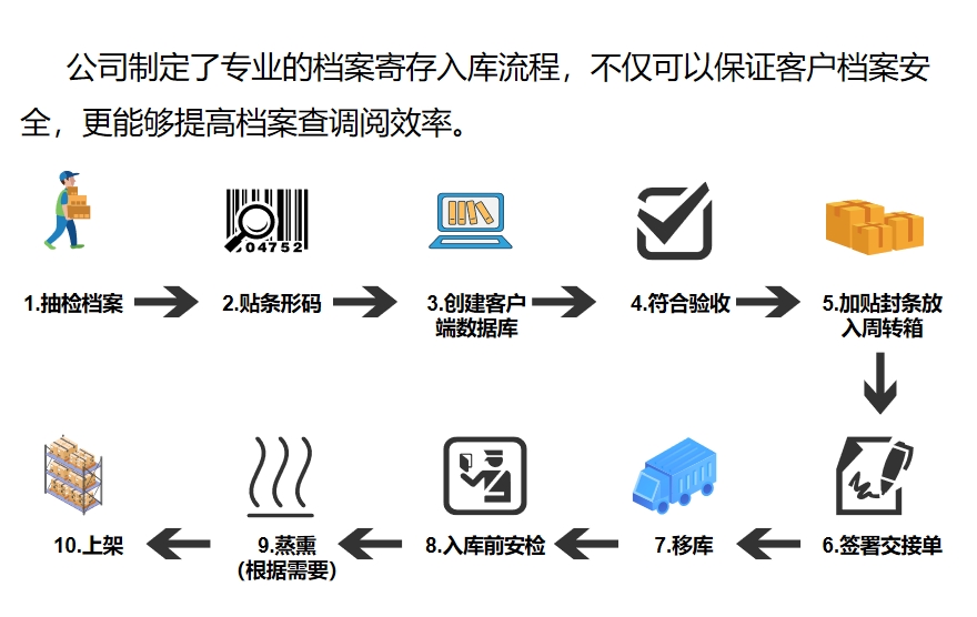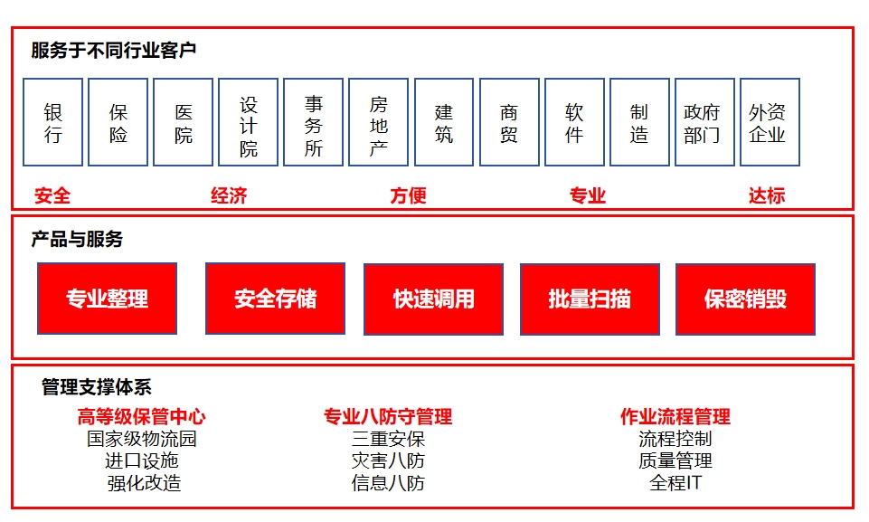 档案托管寄存服务解决方案 公司作为国内专业从事档案寄存、档案托管、档案外包股务、档案信息化建设的知名企业,始终坚持以客户需求为中心,针对各级政府机关、企事业单位在档案管理过程中面临的库房紧张、专业管理人员紧缺、档案遗失等一系列问题,按照国家档案库房要求建设了高标准的档案寄存中心。中心占地面积7000 平方米,可存储档案 40万标准箱,是山东省内最大的档案托管寄存基地,可以为用户提供专业、安全、高效的档案托管寄存整体解决方案和档案整理、存储、调阅、销毁、物流等全过程服务,帮助客户实现档案管理水平与质量的升级,提升档案管理市场化、专业化、规范化水平,解除用户档案管理的后顾之忧,体现更节省、更安全、更便捷的价值理念,是用户身边的档案管理专家。 档案寄存托管流程 档案寄存服务内容 |